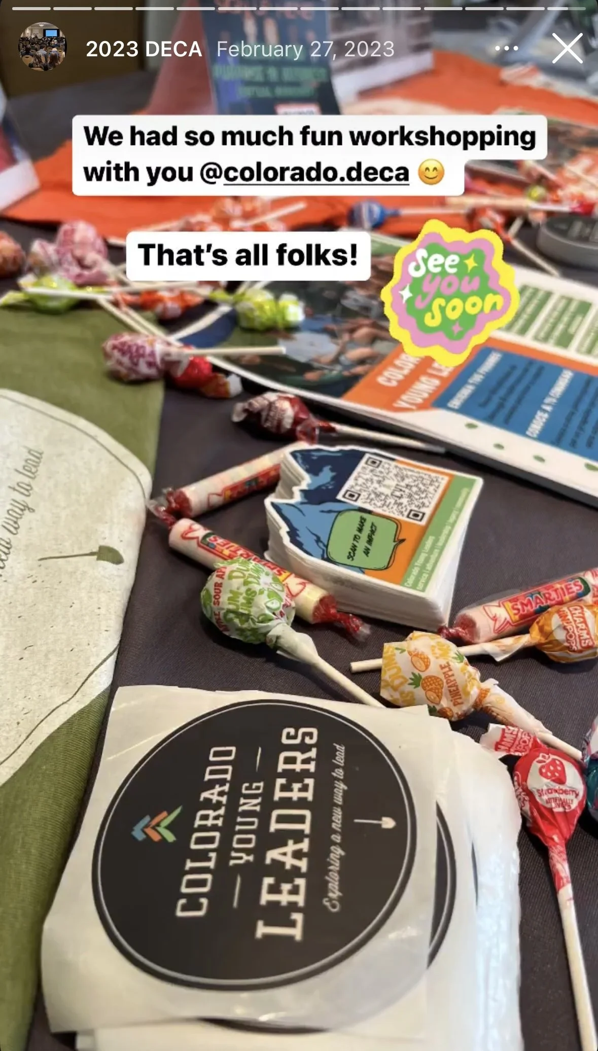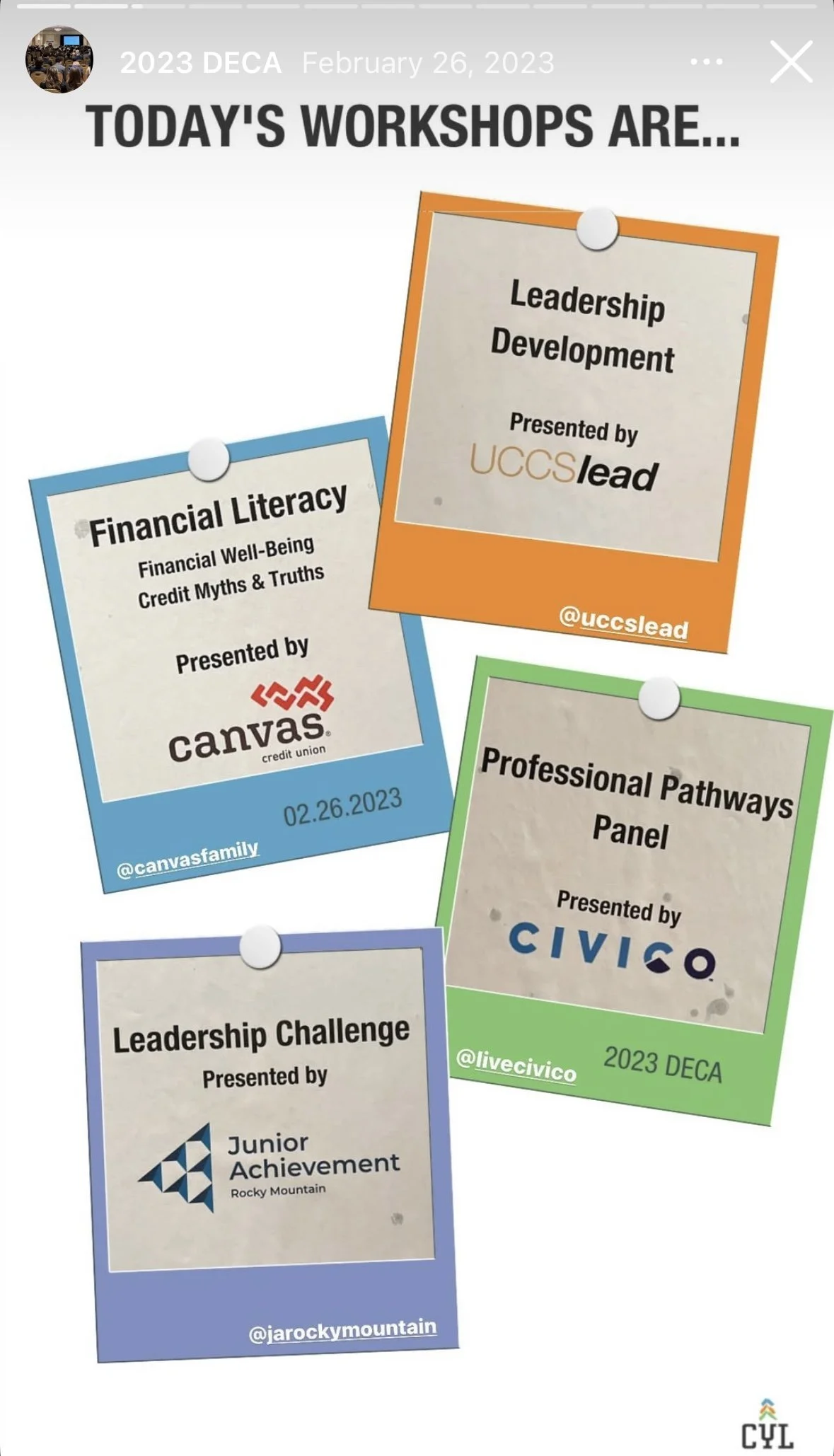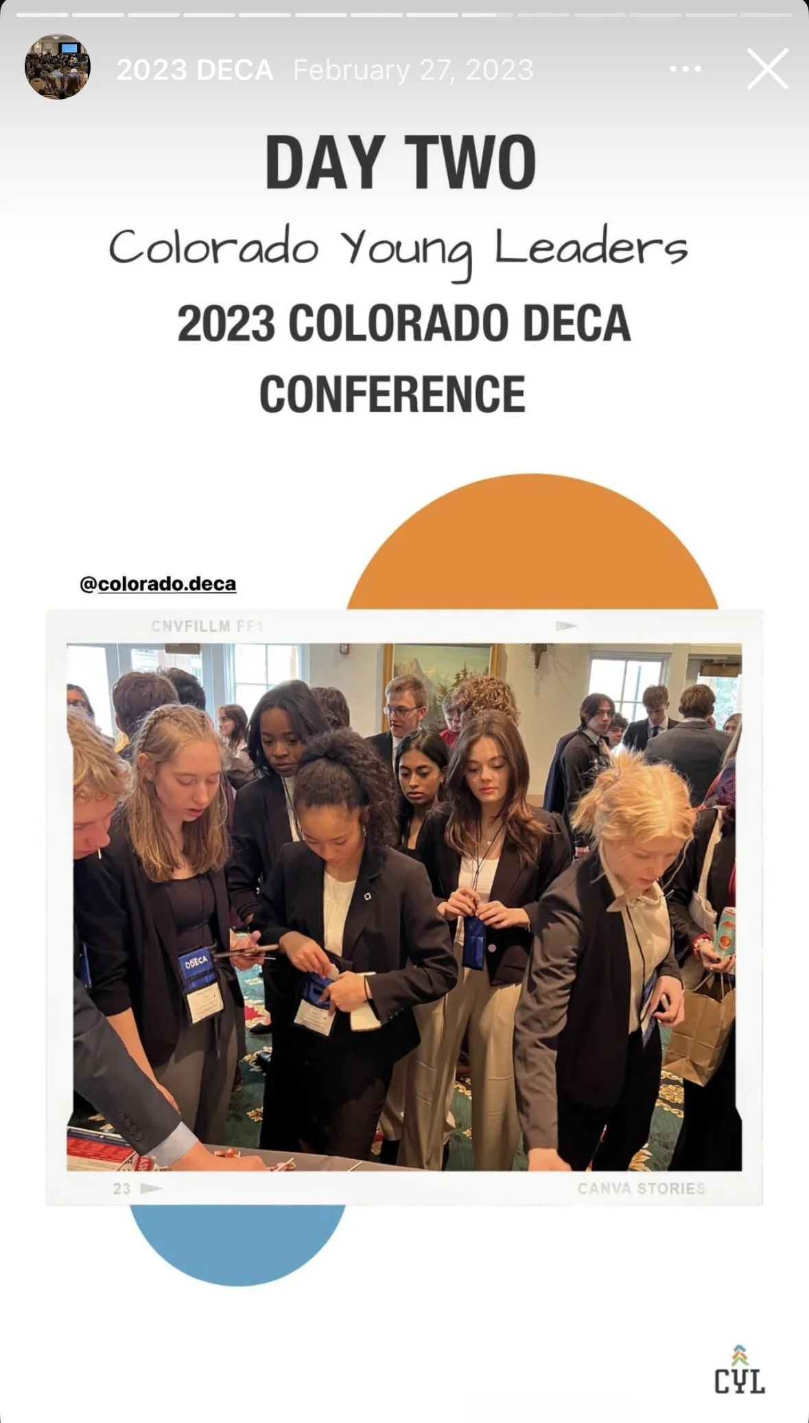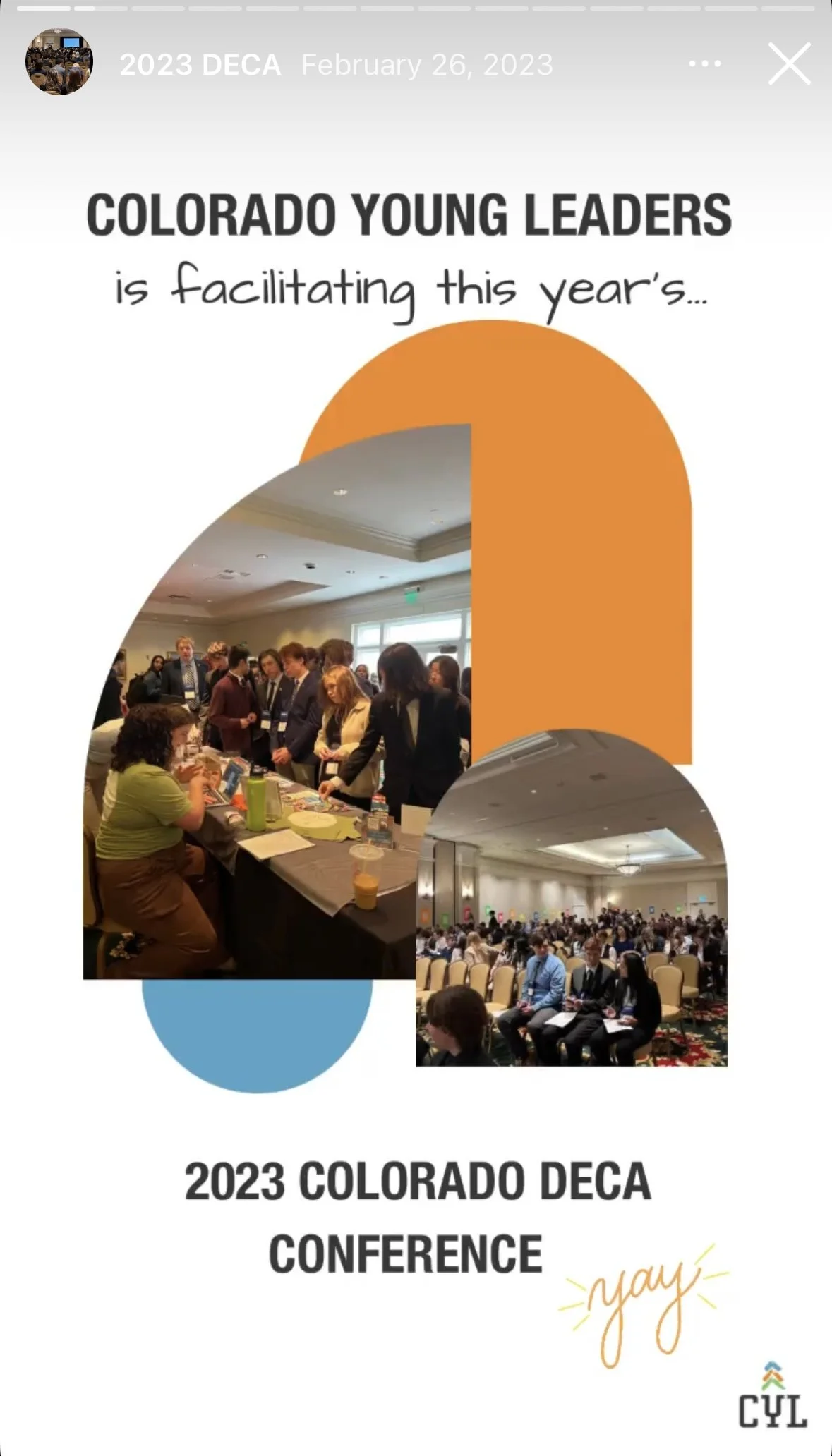 I also supported CYL during the 2023 Colorado DECA State Career Development Conference, held at The Broadmoor in Colorado Springs. Colorado DECA is a statewide organization that prepares emerging leaders and entrepreneurs in marketing, finance, hospitality, and management at the high school level. At the event, I assisted with workshop coordination by helping set up sessions, connecting with workshop hosts, and engaging with student attendees. I also documented the event live on Instagram Stories, providing real-time updates on workshops, key moments, and behind-the-scenes highlights to help capture the energy of the event and expand its reach online.