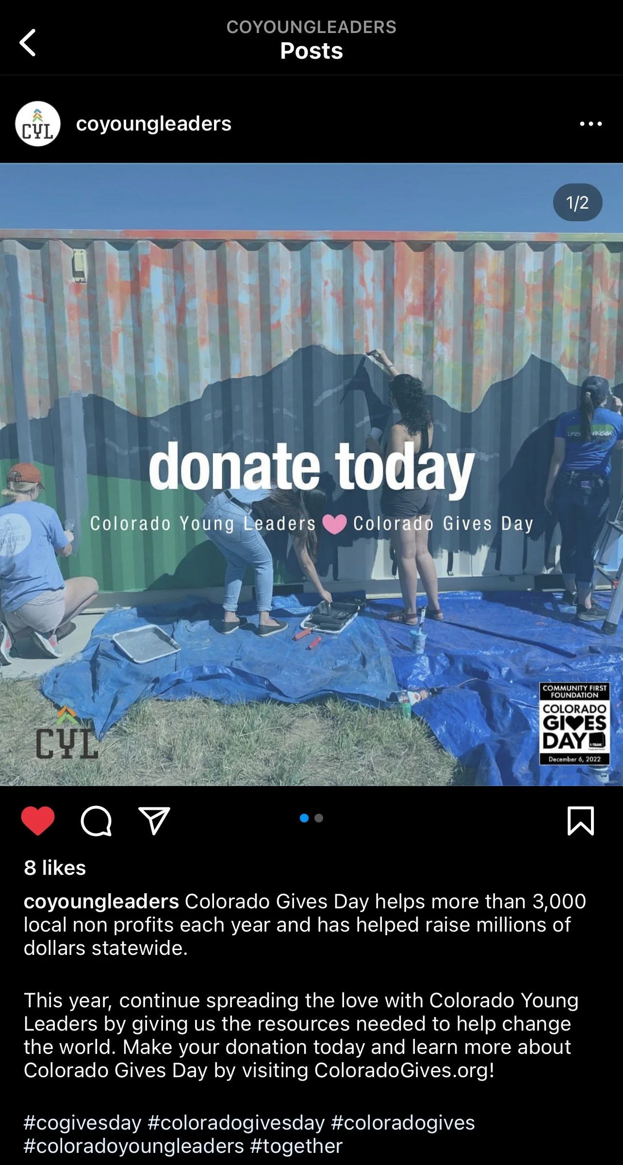 After the challenge ended, I took on the social media marketing for Colorado Gives Day, a 24-hour online giving event that most non-profits introduce to followers a month in advance. I had many ideas for this campaign, some of my favorites being the Giving Tuesday and Fun Fact Friday posts that led up to December 6th, 2022 (The official 2022 Colorado Gives Day).